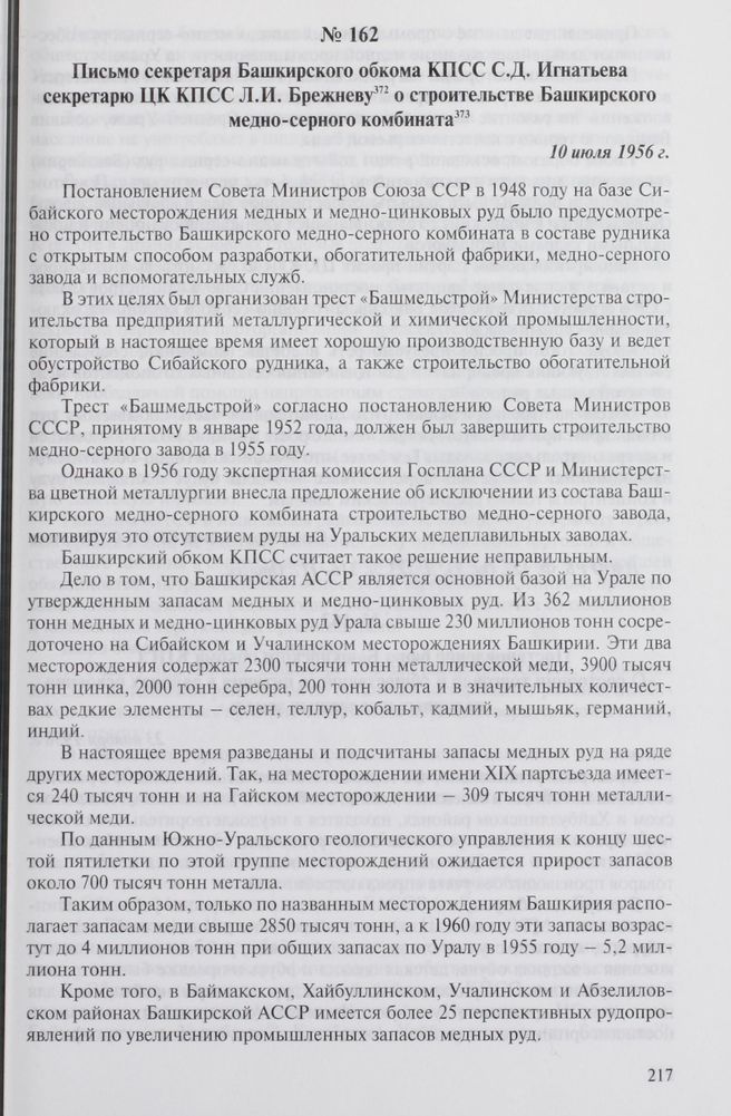 Письмо секретаря Башкирского обкома КПСС С.Д. Игнатьева секретарю ЦК КПСС Л.И. Брежневу о строительстве Башкирского медно-серного комбината. 10 июля 1956 г. // ЦАОО РБ. Ф. 122. Оп. 33. Д. 223. Л. 116-117. Отпуск.