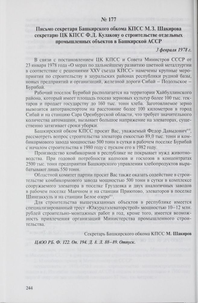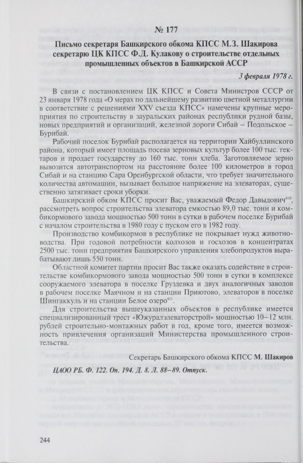 Письмо секретаря Башкирского обкома КПСС М.З. Шакирова секретарю ЦК КПСС Ф.Д. Кулакову о строительстве отдельных промышленных объектов в Башкирской АССР. 3 февраля 1978 г. // ЦАОО РБ. Ф. 122. Оп. 194. Д. 8. Л. 88-89. Отпуск.