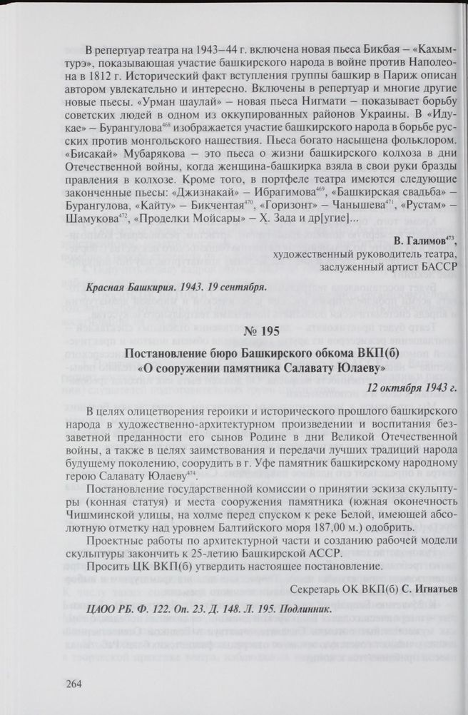 Постановление бюро Башкирского обкома ВКП(б) «О сооружении памятника Салавату Юлаеву». 12 октября 1943 г. // ЦАОО РБ. Ф. 122. Оп. 23. Д. 148. Л. 195. Подлинник.