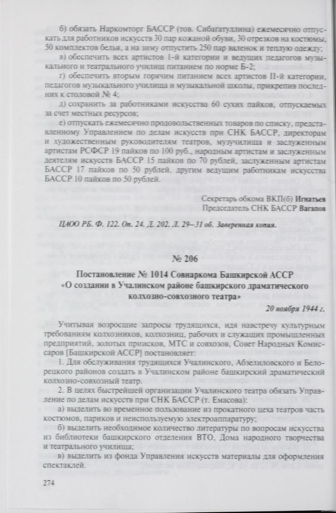Постановление № 1014 Совнаркома Башкирской АССР «О создании в Учалинском районе башкирского драматического колхозно-совхозного театра». 20 ноября 1944 г.