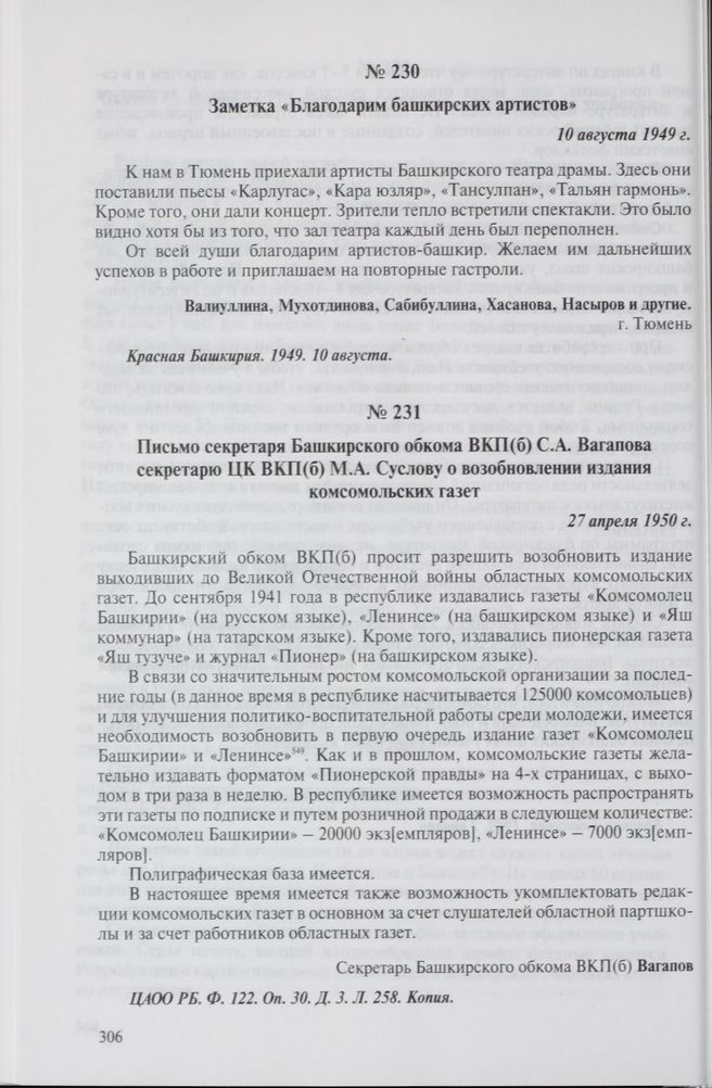 Заметка «Благодарим башкирских артистов». 10 августа 1949 г. // Красная Башкирия. 1949. 10 августа.