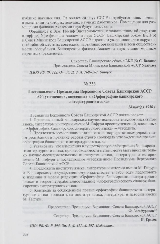 Постановление Президиума Верховного Совета Башкирской АССР «Об уточнениях, внесенных в «Орфографию башкирского литературного языка». 28 ноября 1950 г. // ЦИА РБ. Ф. P-394. Оп. 5. Д. 411. Л. 192. Подлинник.