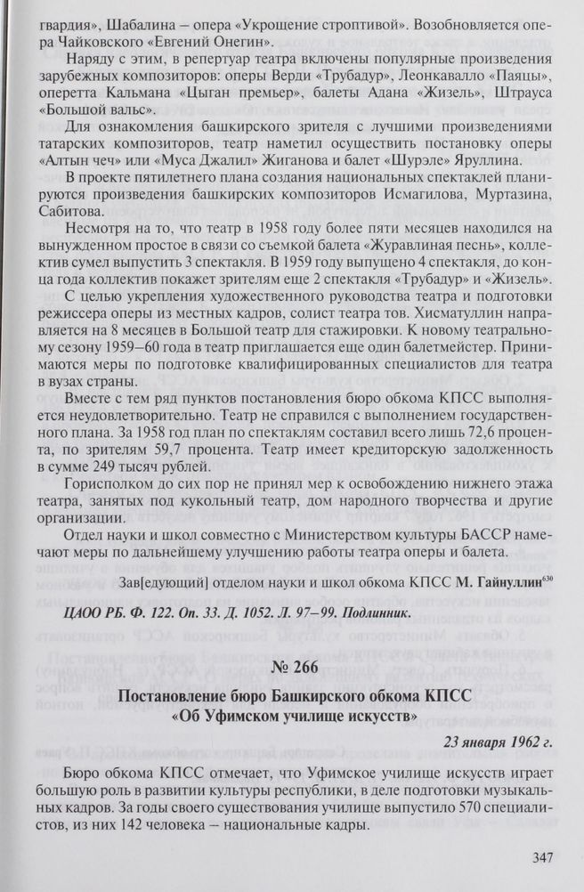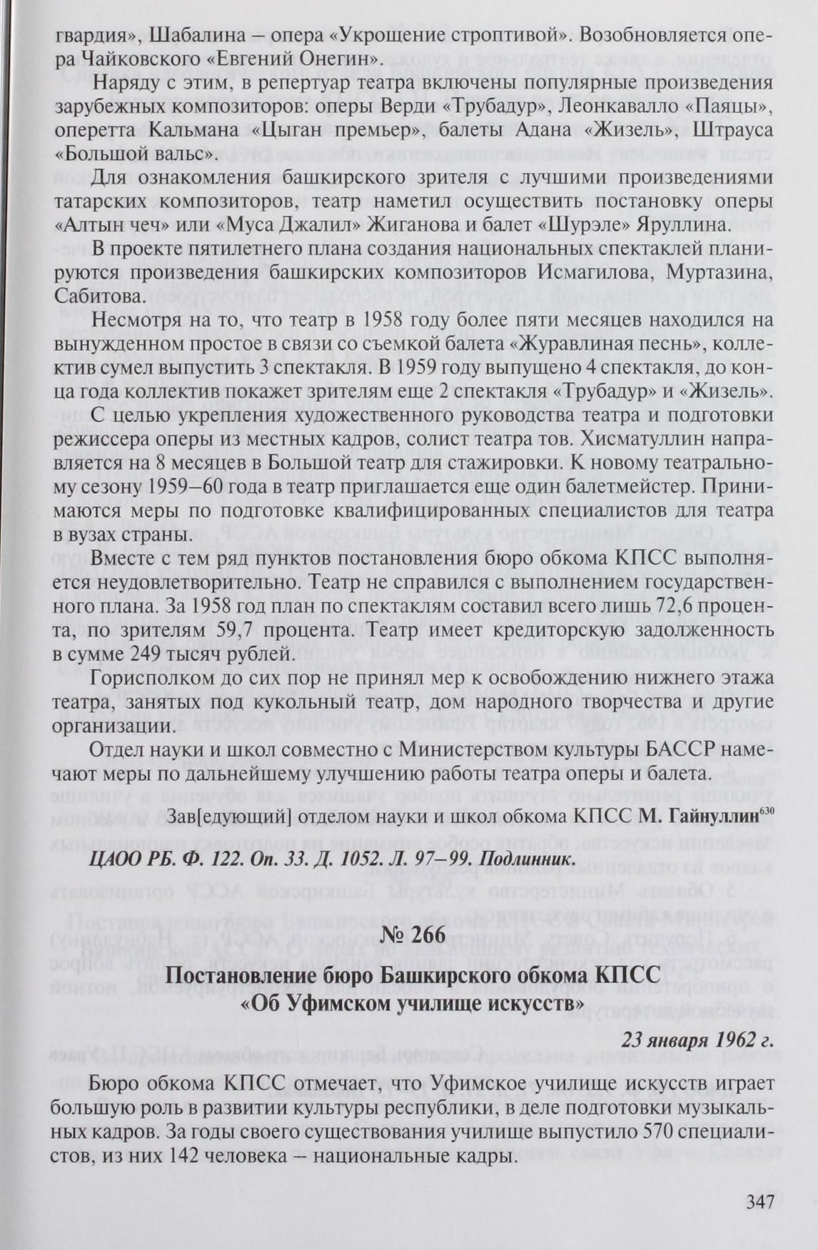 Постановление бюро Башкирского обкома КПСС «Об Уфимском училище искусств». 23 января 1962 г. // ЦАОО РБ. Ф. 122. Оп. 71. Д. 21. Л. 13—15. Подлинник.