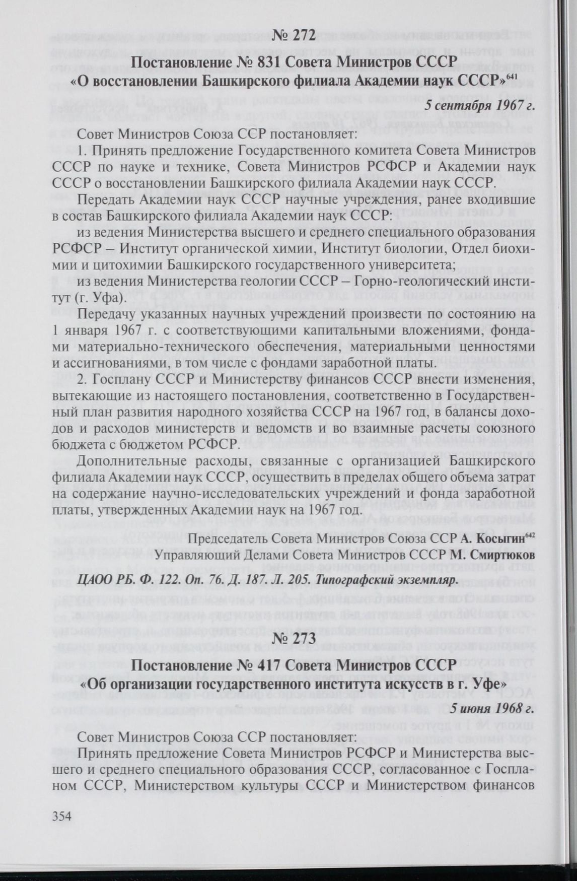 Постановление № 417 Совета Министров СССР «Об организации государственного института искусств в г. Уфе». 5 июня 1968 г. // ЦАОО РБ. Ф. 122. Оп. 77. Д. 152. Л. 211. Типографский экземпляр.