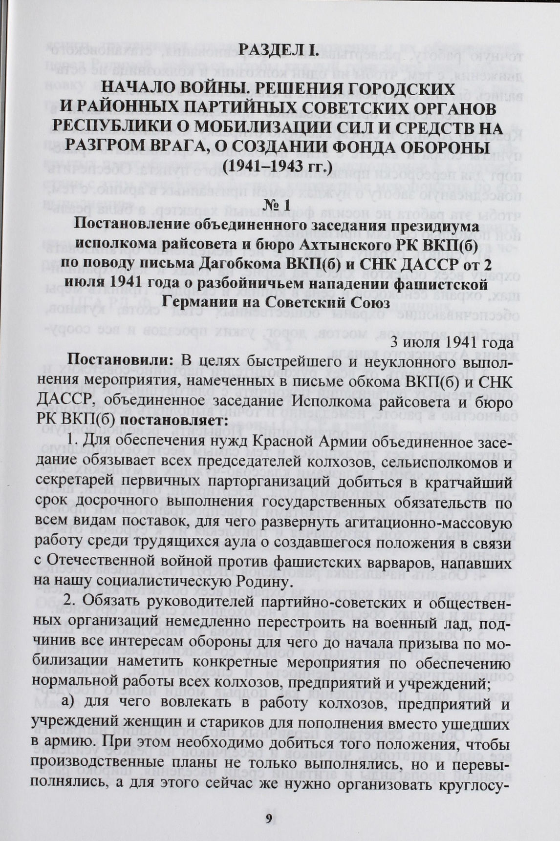 Постановление объединенного заседания президиума исполкома райсовета и бюро Ахтынского РК ВКП(б) по поводу письма Дагобкома ВКП(б) и СНК ДАССР от 2 июля 1941 года о разбойничьем нападении фашистской Германии на Советский Союз. 3 июля 1941 года