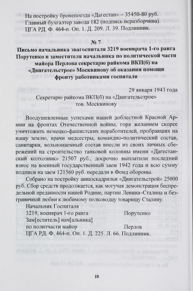 Письмо начальника эвагоспиталя 3219 военврача 1-го ранга Порутенко и заместителя начальника по политической части майора Перлова секретарю райкома ВКП(б) на «Двигательстрое» Москвинову об оказании помощи фронту работниками госпиталя. 29 января 1943 года // ЦГА РД. Ф. 464-п. Оп. 1. Д. 225. Л. 66. Подлинник.