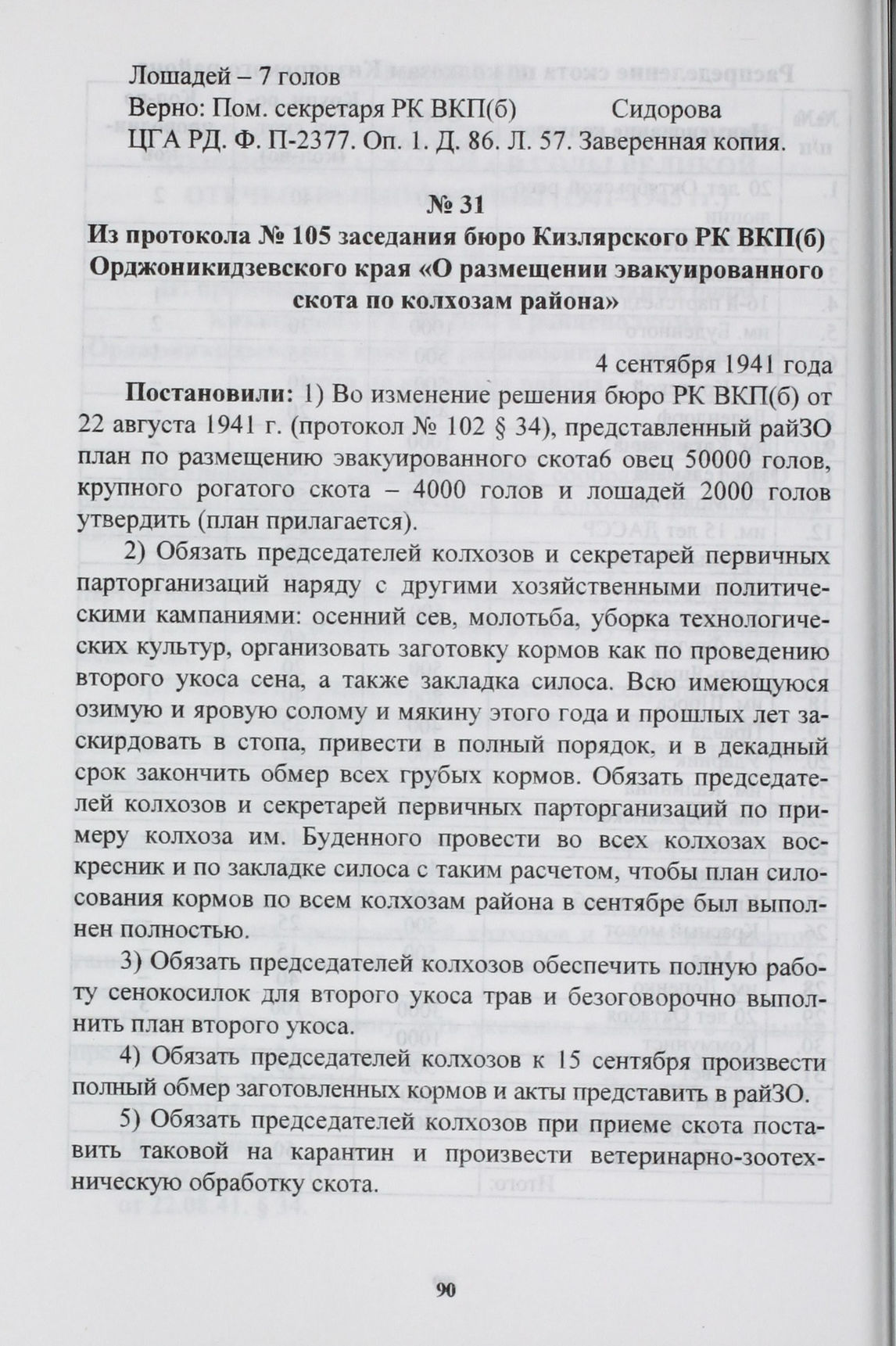Из протокола № 105 заседания бюро Кизлярского РК ВКП(б) Орджоникидзевского края «О размещении эвакуированного скота по колхозам района». 4 сентября 1941 года