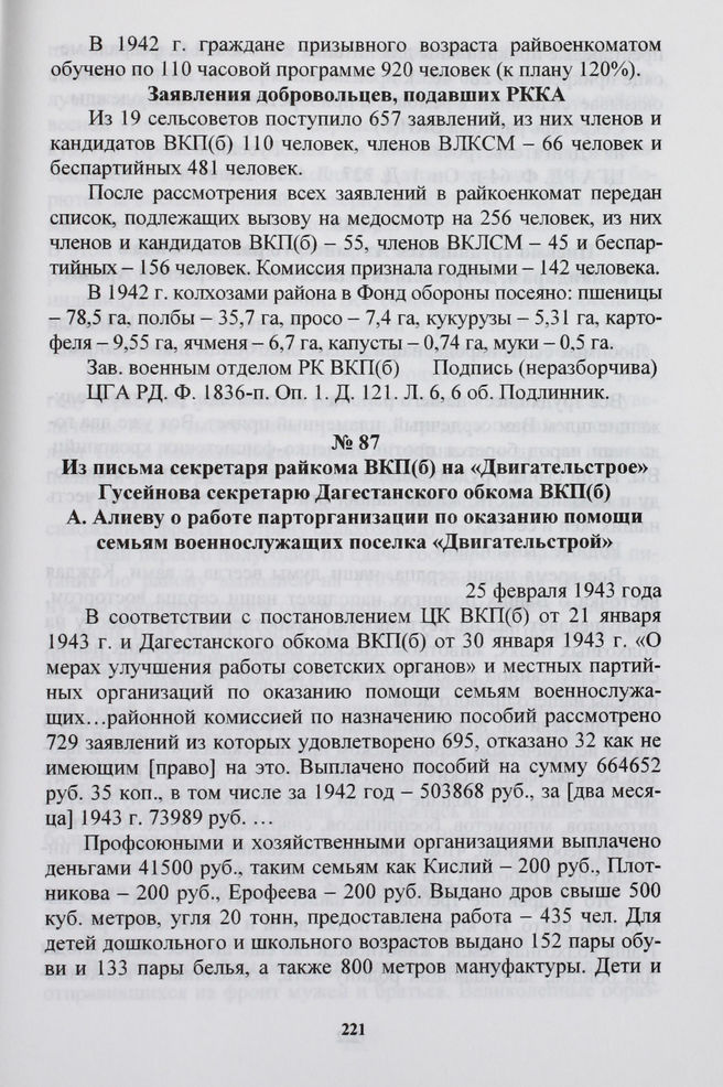 Из письма секретаря райкома ВКП(б) на «Двигательстрое» Гусейнова секретарю Дагестанского обкома ВКП(б) А. Алиеву о работе парторганизации по оказанию помощи семьям военнослужащих поселка «Двигательстрой». 25 февраля 1943 года