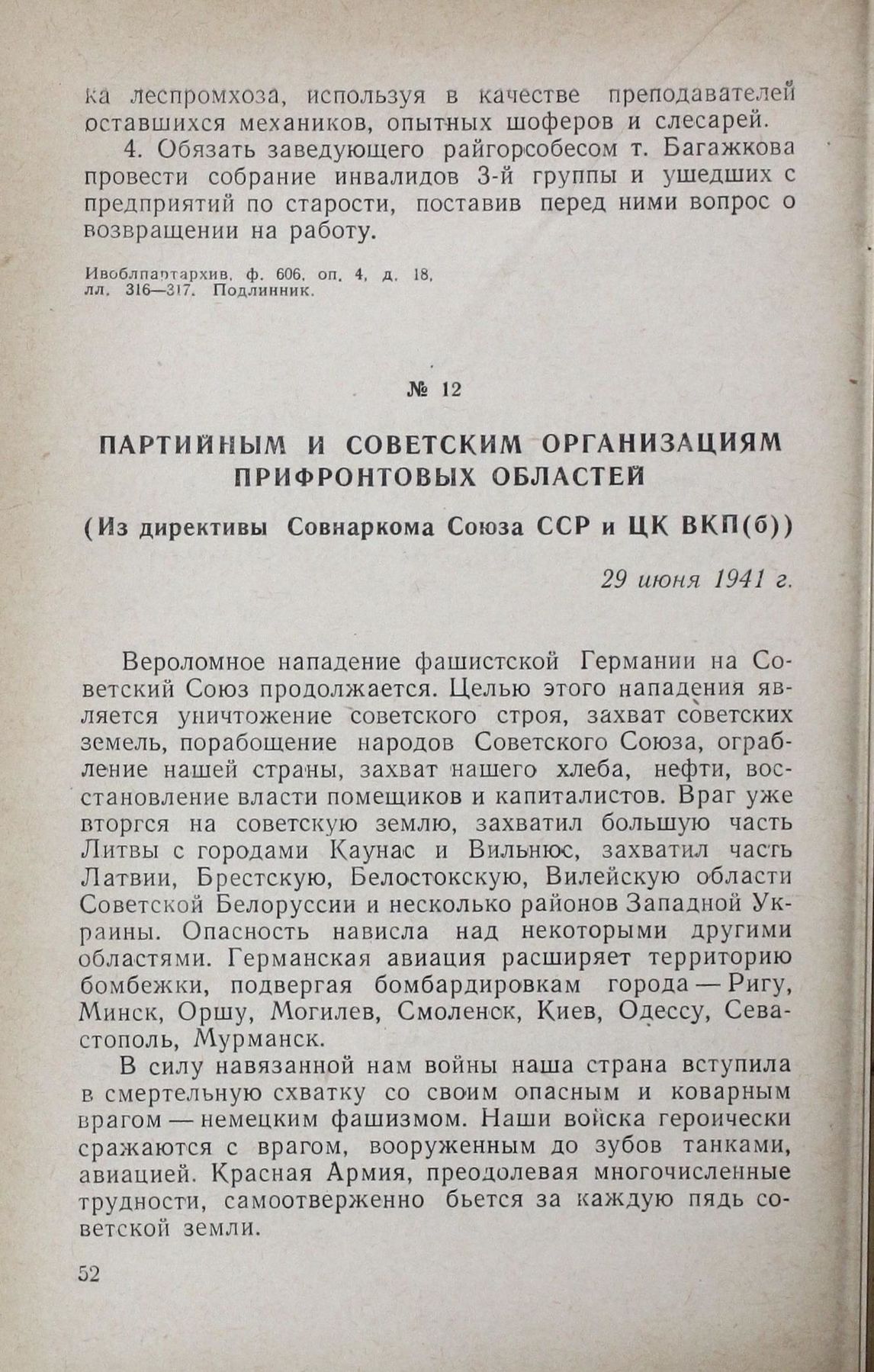 Партийным и советским организациям прифронтовых областей. (Из директивы Совнаркома Союза ССР и ЦК ВКП(б)). 29 июня 1941 г. // КПСС о вооруженных силах Советского Союза. Госполитиздат, 1958, стр. 354—356.
