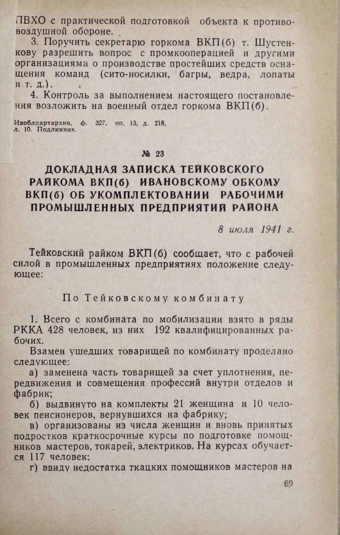 Докладная записка Тейковского райкома ВКП(б) Ивановскому обкому ВКП(б) об укомплектовании рабочими промышленных предприятий района. 8 июля 1941 г. // Ивоблпартархив, ф. 327, оп. 13, д. 111, л. 54. Подлинник.