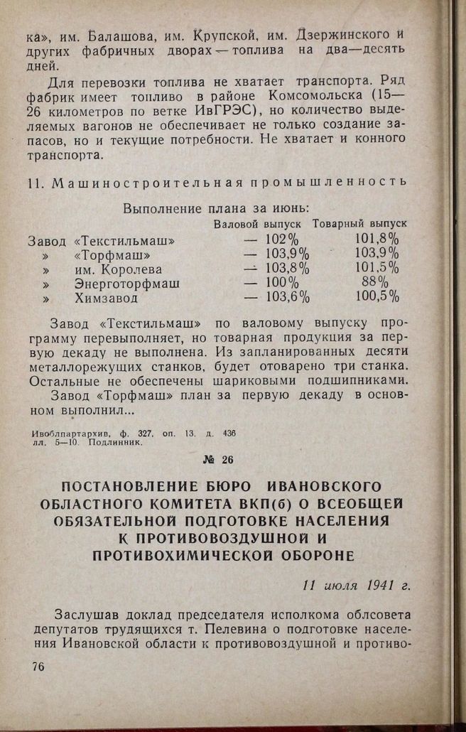Постановление бюро Ивановского областного комитета ВКП(б) о всеобщей обязательной подготовке населения к противовоздушной и противохимической обороне. 11 июля 1941 г. // Ивоблпартархив, ф. 327, оп. 13, д. 13, лл. 122—124. Подлинник.