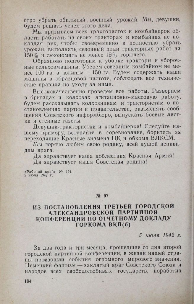 Из постановления третьей городской Александровской партийной конференции по отчетному докладу горкома ВКП(б). 5 июля 1942 г. // Владоблпартархив, ф. 119, оп. 3, д. 206, лл. 79—83. Подлинник.
