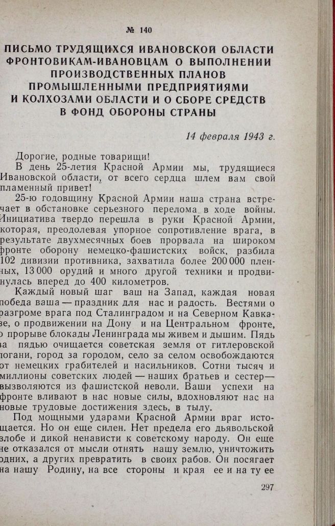 Письмо трудящихся Ивановской области фронтовикам-ивановцам о выполнении производственных планов промышленными предприятиями и колхозами области и о сборе средств в фонд обороны страны. 14 февраля 1943 г.
