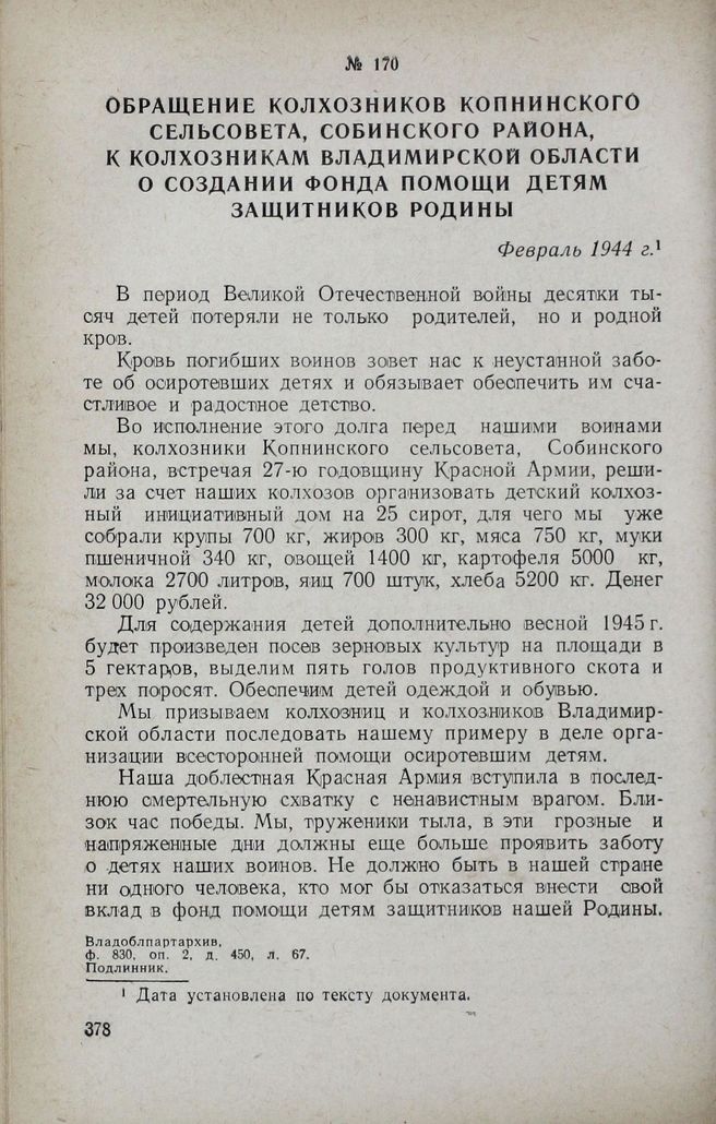 Обращение колхозников Копнинского сельсовета, Собинского района, к колхозникам Владимирской области о создании фонда помощи детям защитников Родины. Февраль 1944 г.