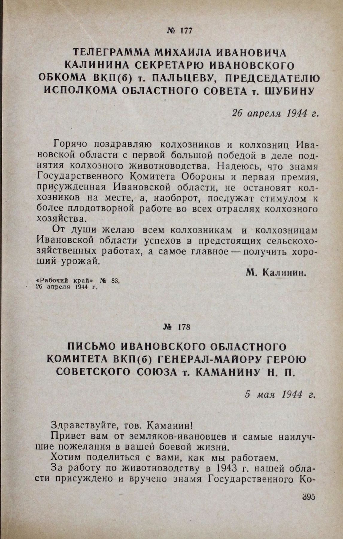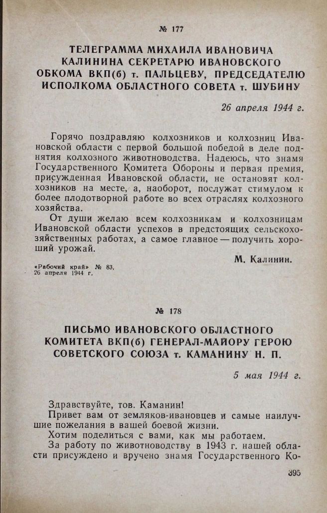Письмо Ивановского областного комитета ВКП(б) генерал-майору Герою Советского Союза т. Каманину Н. П. 5 мая 1944 г. // Ивоблпартархив, ф. 773, оп. 1, д. 278, л. 10. Копия.