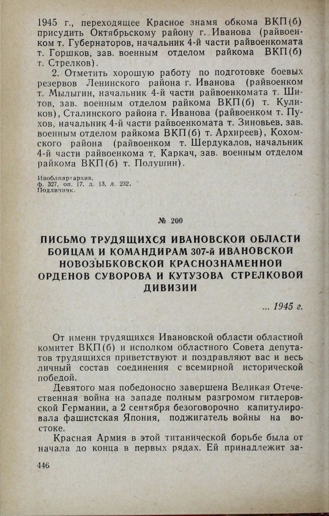 Письмо трудящихся Ивановской области бойцам и командирам 307-й Ивановской Новозыбковской Краснознаменной орденов Суворова и Кутузова стрелковой дивизии. 1945 г. // Ивоблпартархив, ф. 773, оп. 1, д. 168, лл. 263-265. Копия.