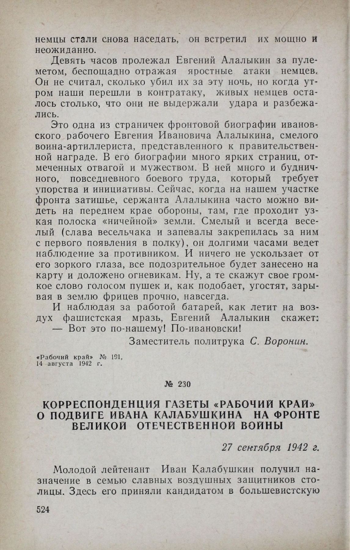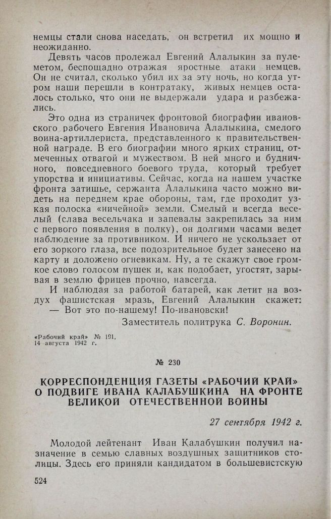 Корреспонденция газеты «Рабочий край» о подвиге Ивана Калабушкина на фронте Великой Отечественной войны. 27 сентября 1942 г. // «Рабочий край» № 229, 27 сентября 1942 г.