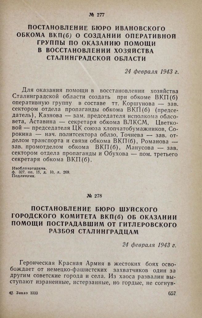 Постановление бюро Шуйского городского комитета ВКП(б) об оказании помощи пострадавшим от гитлеровского разбоя сталинградцам. 24 февраля 1943 г. // Ивоблпартархив, ф. 806, оп. 3, д. 507, л. 63. Подлинник.