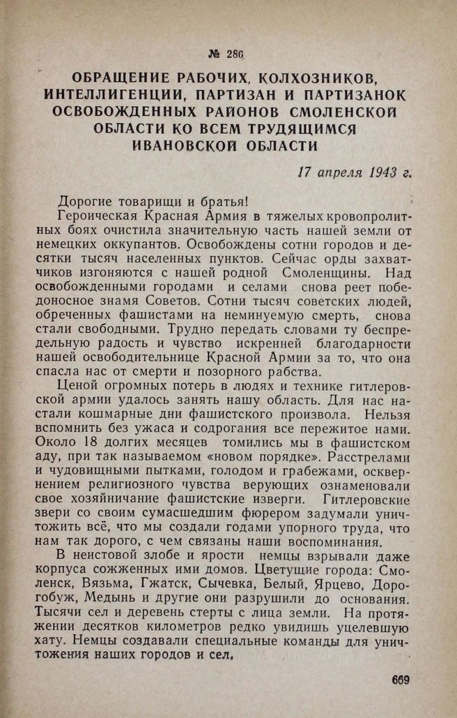 Обращение рабочих, колхозников, интеллигенции, партизан и партизанок освобожденных районов Смоленской области ко всем трудящимся Ивановской области. 17 апреля 1943 г.