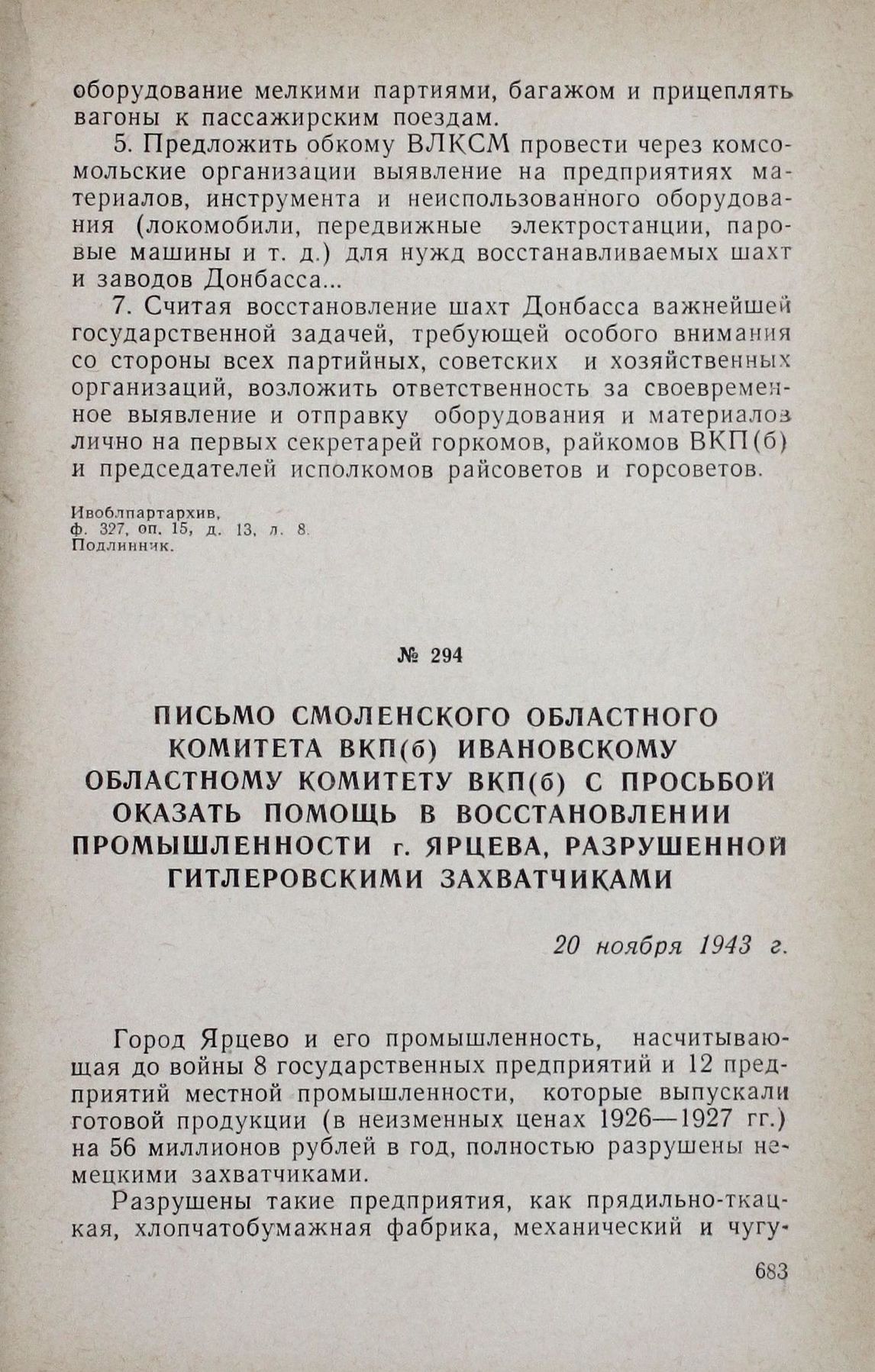Письмо Смоленского областного комитета ВКП(б) Ивановскому областному комитету ВКП(б) с просьбой оказать помощь в восстановлении промышленности г. Ярцева, разрушенной гитлеровскими захватчиками. 20 ноября 1943 г. // Ивоблпартархив, ф. 327, оп. 15, д. 66, л. 295. Подлинник.