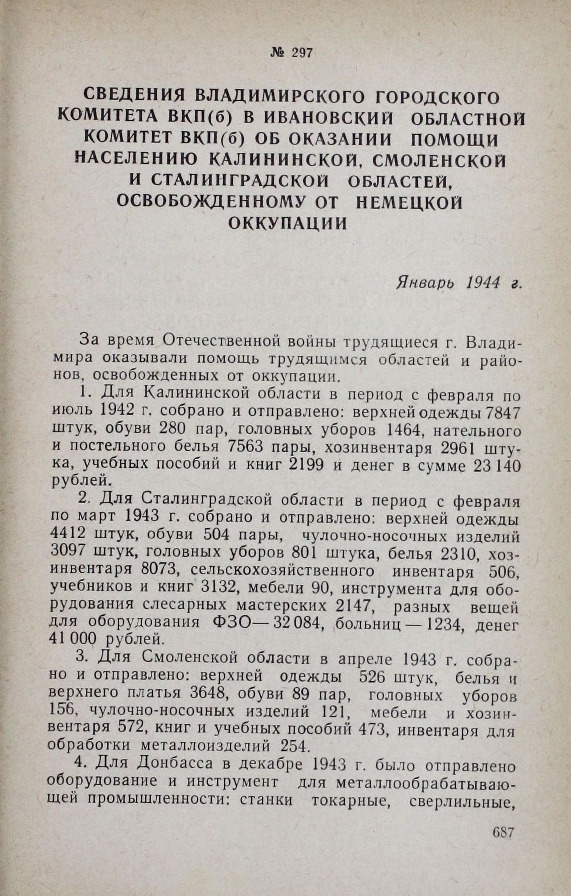 Сведения Владимирского городского комитета ВКП(б) в Ивановский областной комитет ВКП(б) об оказании помощи населению Калининской, Смоленской и Сталинградской областей, освобожденному от немецкой оккупации. Январь 1944 г.