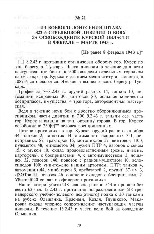 Из боевого донесения штаба 322-й стрелковой дивизии о боях за освобождение Курской области в феврале-марте 1943 г. [Не ранее 8 февраля 1943 г.] // ЦАМО РФ. Ф.1635. Оп.1. Д.4. Л.14,17. Подлинник.