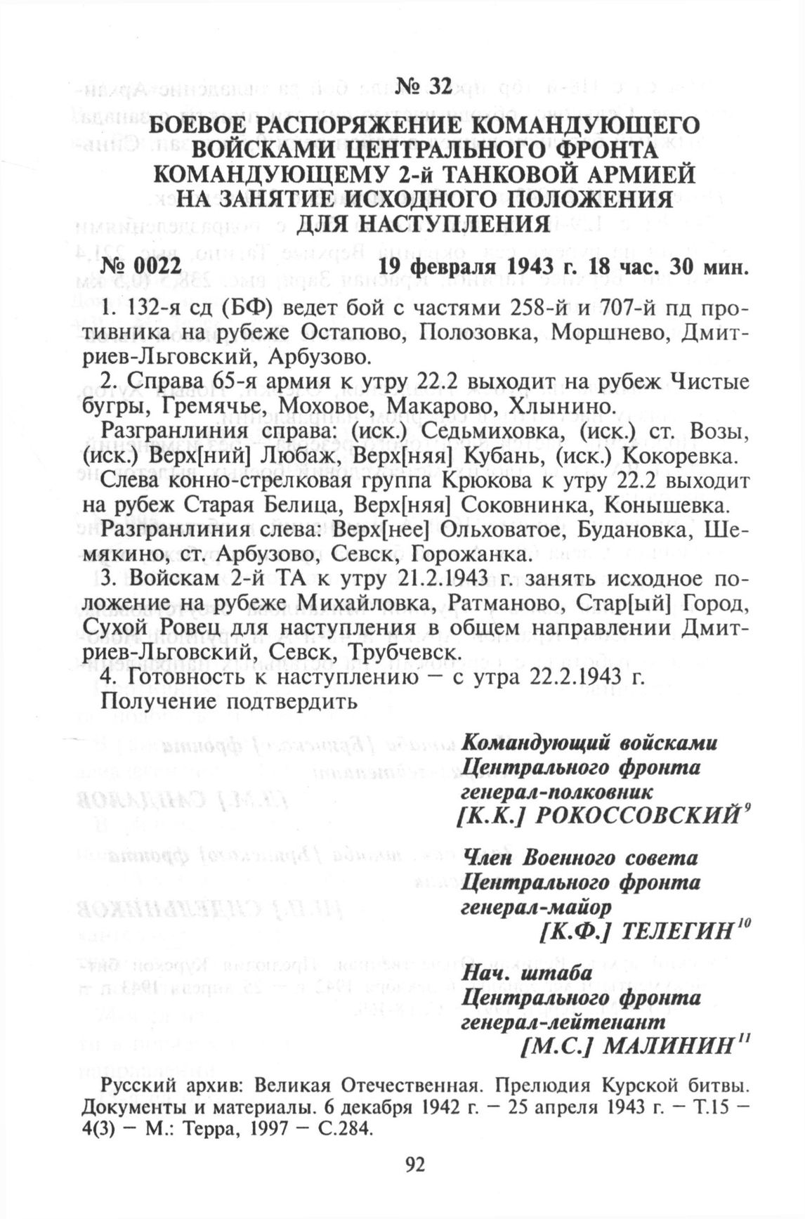 Боевое распоряжение командующего войсками Центрального фронта командующему 2-й танковой армией на занятие исходного положения для наступления. 19 февраля 1943 г. // Русский архив: Великая Отечественная. Прелюдия Курской битвы. Документы и материалы. 6 декабря 1942 г. - 25 апреля 1943 г. - Т.15-4(3) - М.: Терра, 1997-С.284.