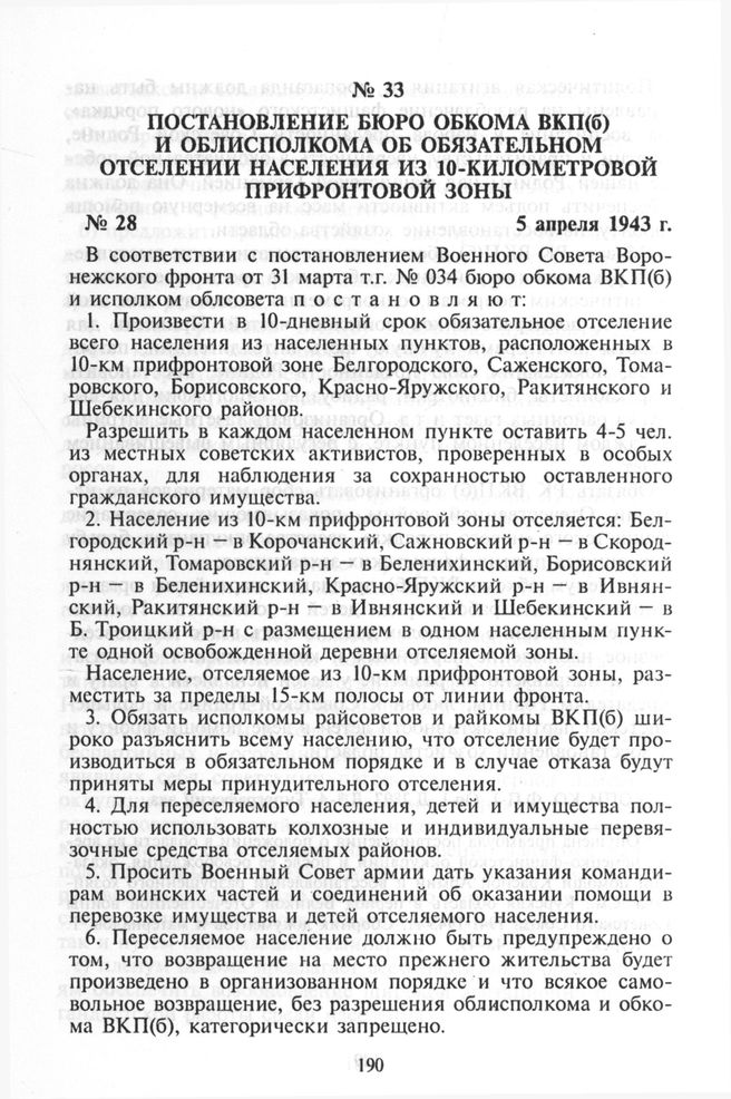 Постановление бюро обкома ВКП(б) и облисполкома об обязательном отселении населения из 10-километровой прифронтовой зоны. 5 апреля 1943 г.
