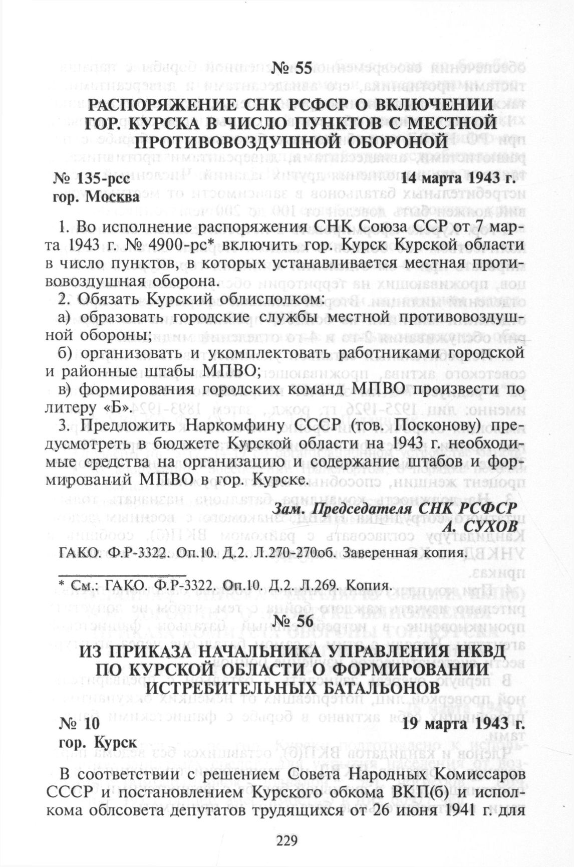 Распоряжение СНК РСФСР о включении гор. Курска в число пунктов с местной противовоздушной обороной. Гор. Москва, 14 марта 1943 г. // ГАКО. Ф.Р-3322. Оп.10. Д.2. Л.270-270об. Заверенная копия.