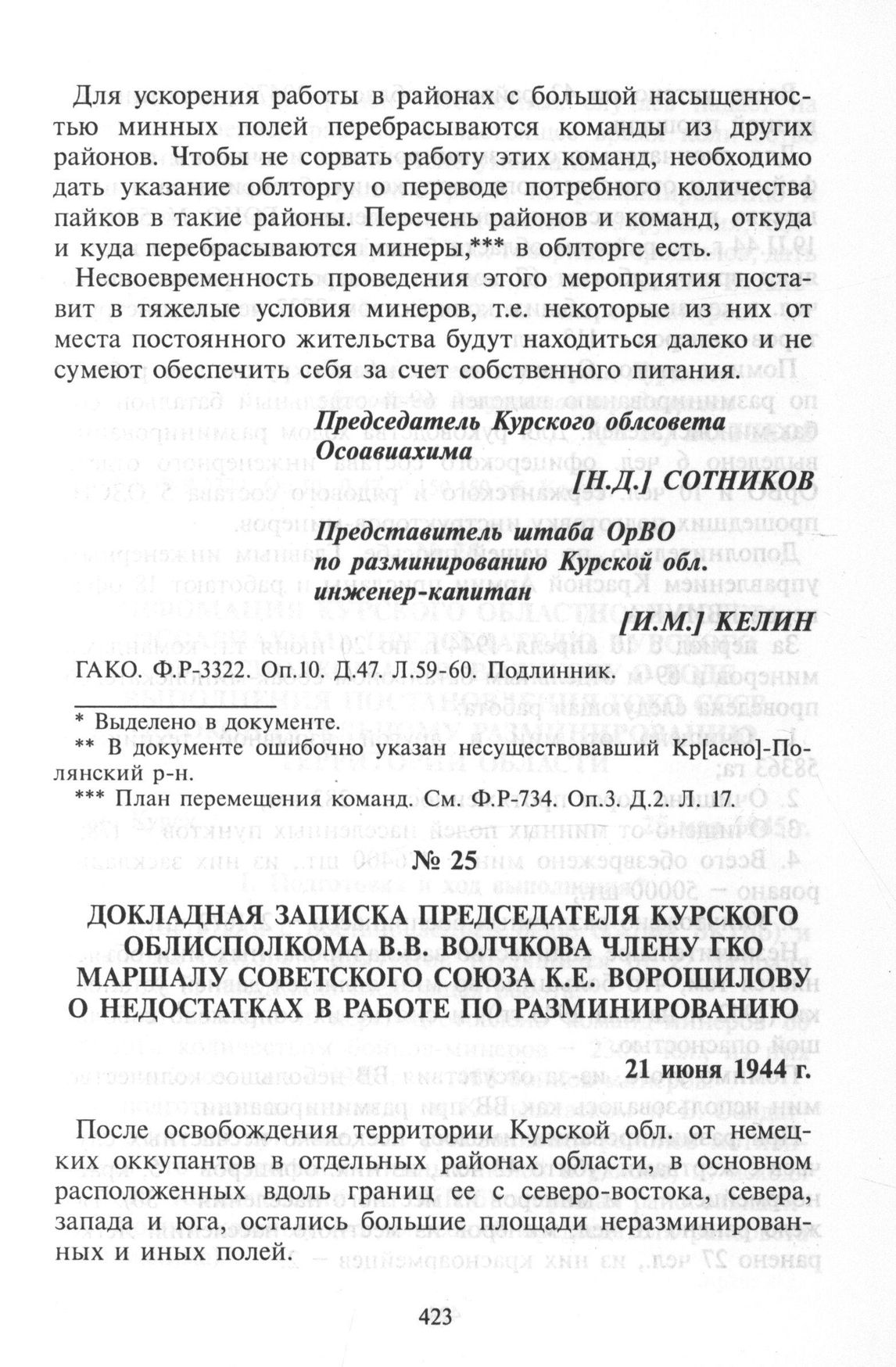 Докладная записка председателя Курского облисполкома В.В. Волчкова члену ГКО маршалу Советского Союза К.Е. Ворошилову о недостатках в работе по разминированию. 21 июня 1944 г. // ГАКО. Ф.Р-3322. Оп.10. Д.47. Л.150,150 об. Копия.