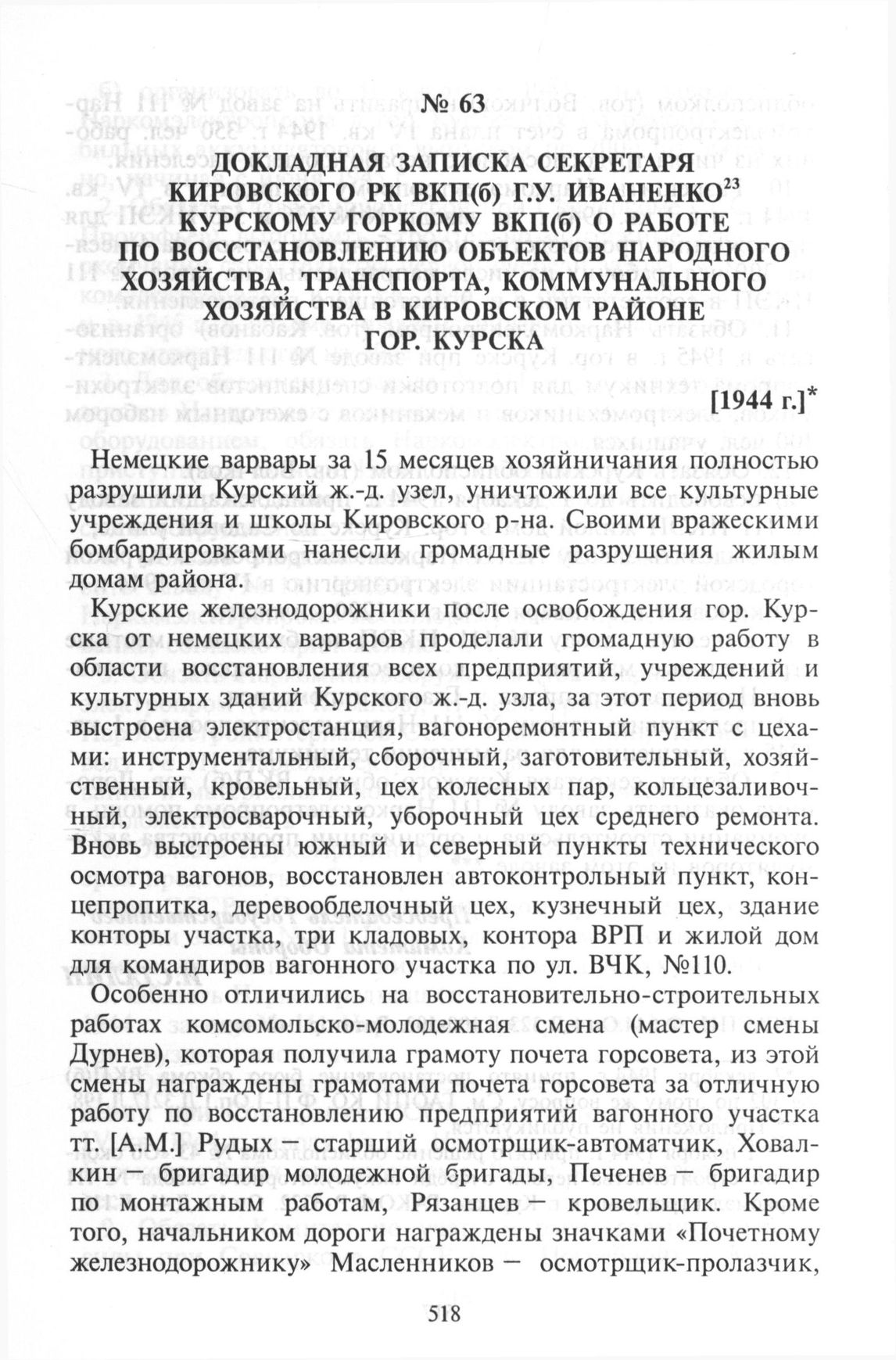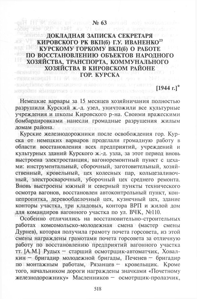 Докладная записка секретаря Кировского РК ВКП(б) Г.У. Иваненко Курскому горкому ВКП(б) о работе по восстановлению объектов народного хозяйства, транспорта, коммунального хозяйства в Кировском районе гор. Курска. [1944 г.] // ГАОПИ КО. Ф.П.-2160. Оп. 1. Д.165. Л.62-63. Подлинник.