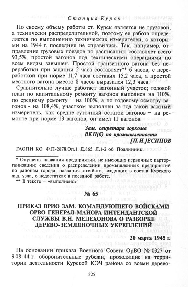 Приказ ВРИО зам. командующего войсками ОРВО генерал-майора интендантской службы В.Н. Мелехонова о разборке дерево-земляночных укреплений. 20 марта 1945 г. // ГАКО. Ф.Р.-3322. Оп.10. Д.61. Л.49-49об. Заверенная копия с копии.