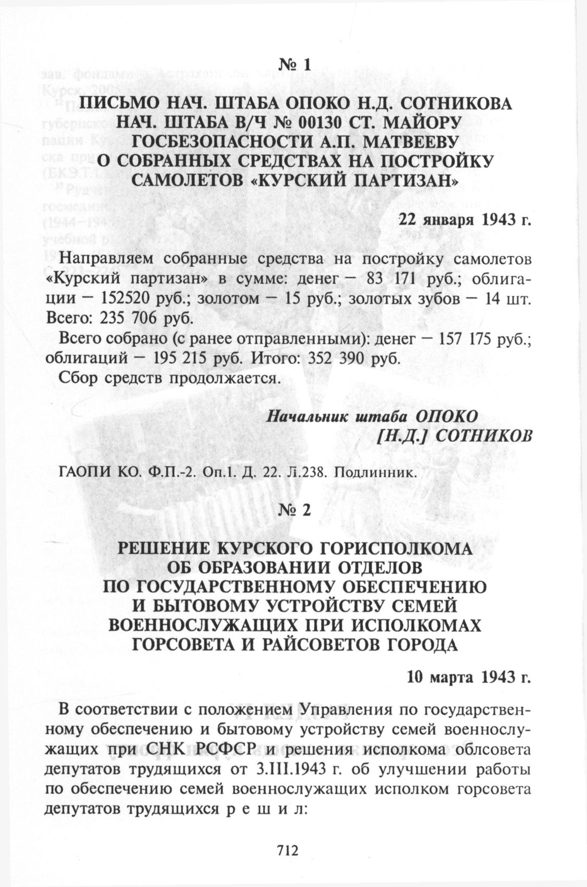 Решение Курского горисполкома об образовании отделов по государственному обеспечению и бытовому устройству семей военнослужащих при исполкомах горсовета и райсоветов города. 10 марта 1943 г. // ГАКО. Ф.Р-770. Оп.2. Д.11. Л. 11-12. Подлинник.
