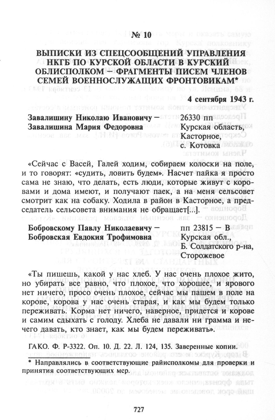 Выписки из спецсообщений управления НКГБ по Курской области в Курский облисполком - фрагменты писем членов семей военнослужащих фронтовикам. 4 сентября 1943 г. // ГАКО. Ф. Р-3322. Оп. 10. Д. 22. Л. 124,135. Заверенные копии.