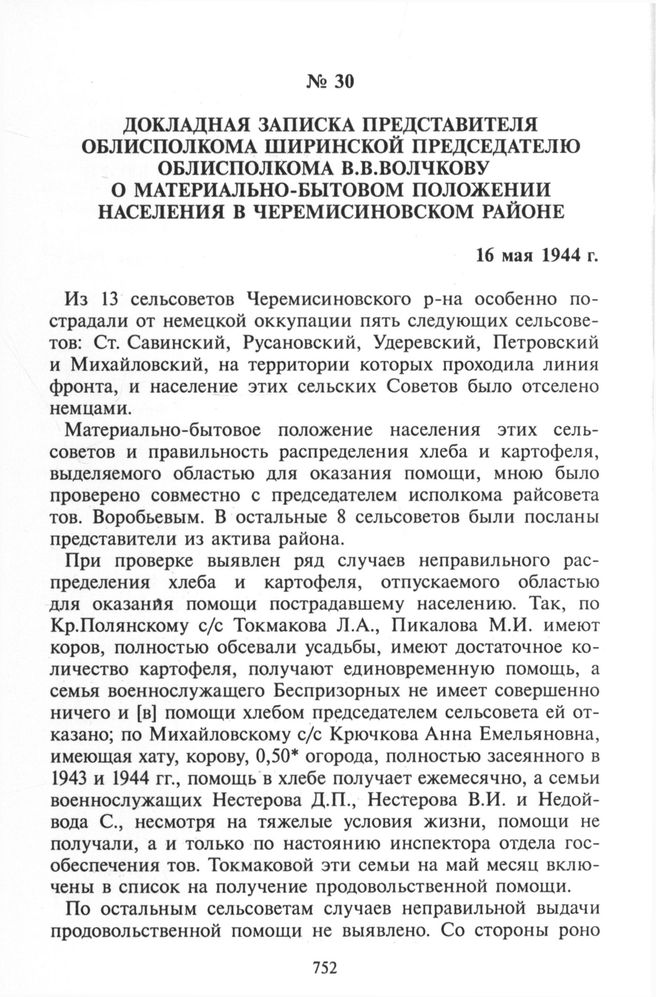 Докладная записка представителя облисполкома Ширинской председателю облисполкома В.В. Волчкову о материально-бытовом положении населения в Черемисиновском районе. 16 мая 1944 г. // ГАКО. Ф.Р-3322. Оп. 10. Д.39. Л.36-38 Подлинник.