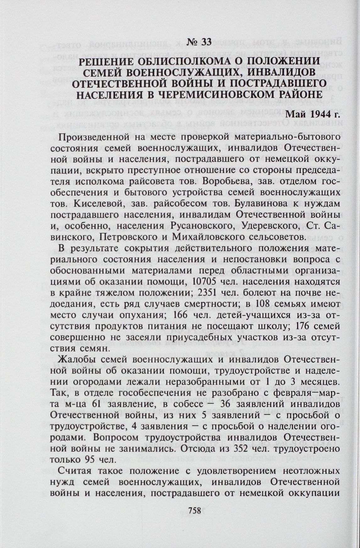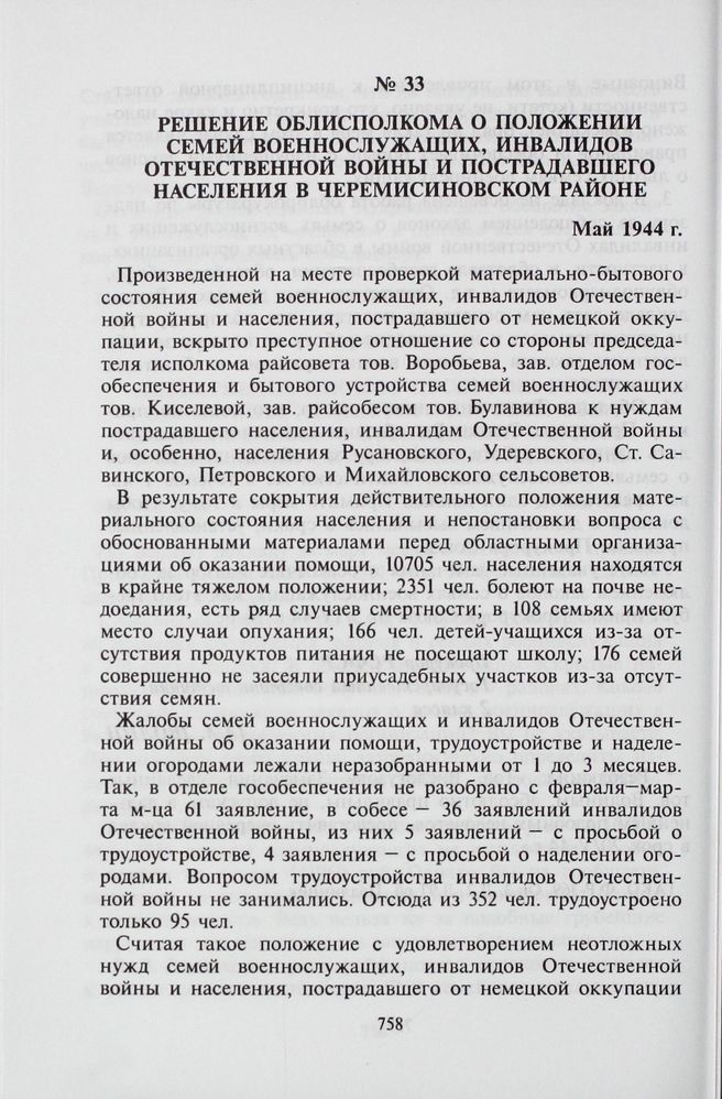 Решение облисполкома о положении семей военнослужащих, инвалидов Отечественной войны и пострадавшего населения в Черемисиновском районе. Май 1944 г.
