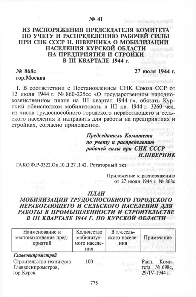 Приложение к распоряжению председателя Комитета по учету и распределению рабочей силы при СНК СССР Н. Шверника от 27 июля 1944 г. План мобилизации трудоспособного городского неработающего и сельского населения для работы в промышленности и строительстве в III квартале 1944 г. по Курской области // ГАКО. Ф.Р.-3322. Оп.10. Д.27. Л.43-44.