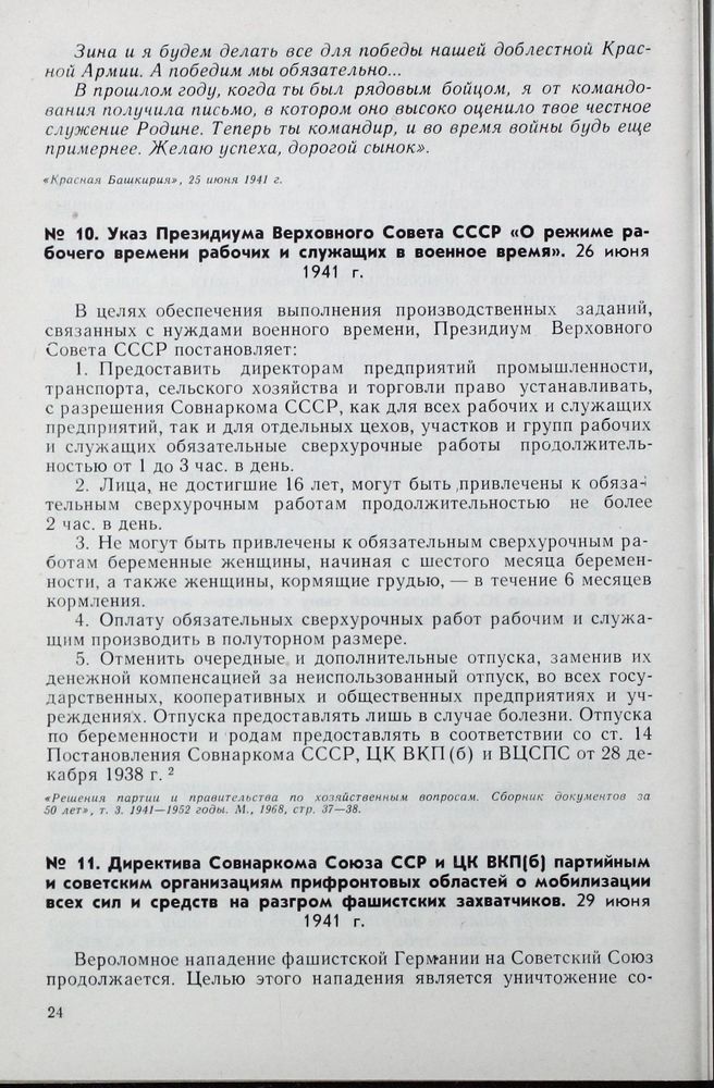 Указ Президиума Верховного Совета СССР «О режиме рабочего времени рабочих и служащих в военное время». 26 июня 1941 г. // «Решения партии и правительства по хозяйственным вопросам. Сборник документов за 50 лет», т. 3. 1941-1952 годы. М., 1968, стр. 37-38.