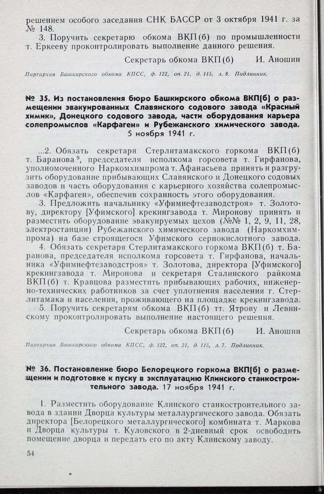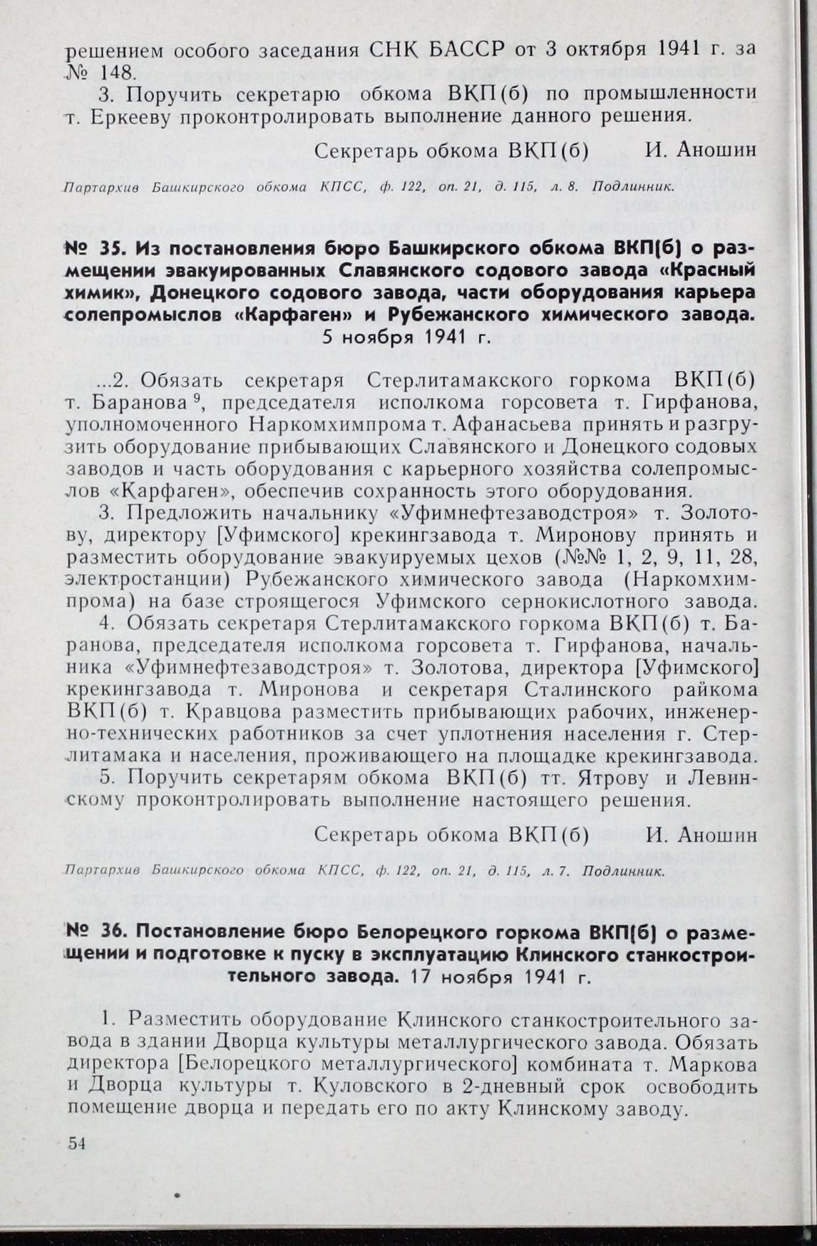 Из постановления бюро Башкирского обкома ВКП(б) о размещении эвакуированных Славянского содового завода «Красный химик», Донецкого содового завода, части оборудования карьера солепромыслов «Карфаген» и Рубежанского химического завода. 5 ноября 1941 г. // Партархив Башкирского обкома КПСС, ф. 122, оп. 21, д. 115, л. 7. Подлинник.