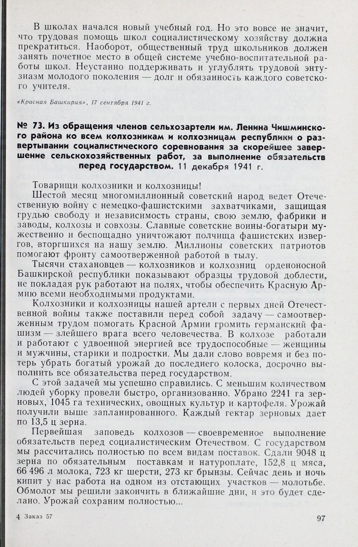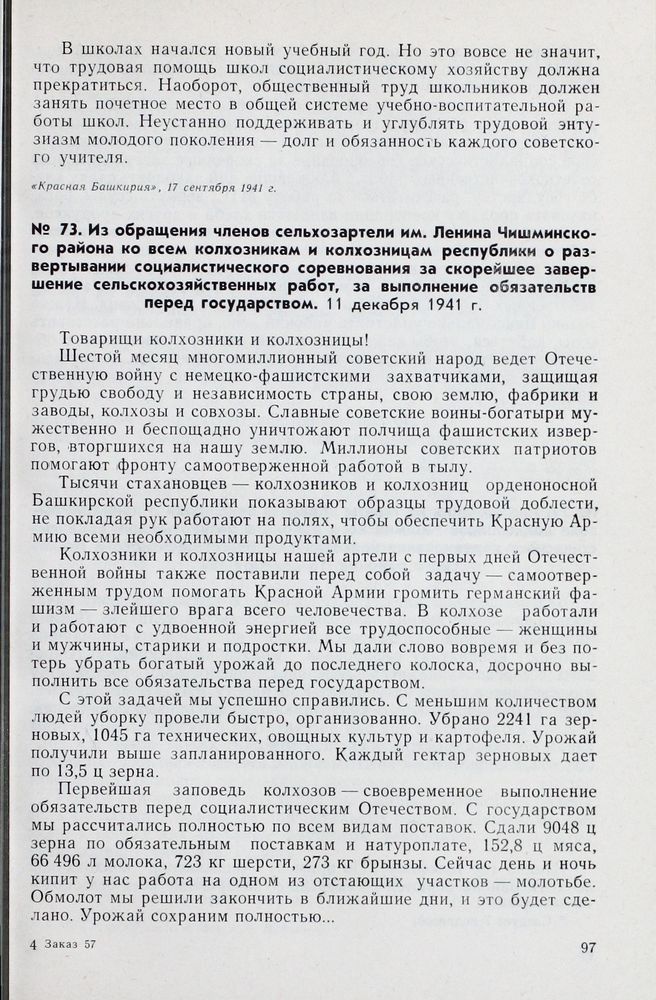 Из обращения членов сельхозартели им. Ленина Чишминского района ко всем колхозникам и колхозницам республики о развертывании социалистического соревнования за скорейшее завершение сельскохозяйственных работ, за выполнение обязательств перед государством. 11 декабря 1941 г. // «Красная Башкирия», 11 декабря 1941 г.