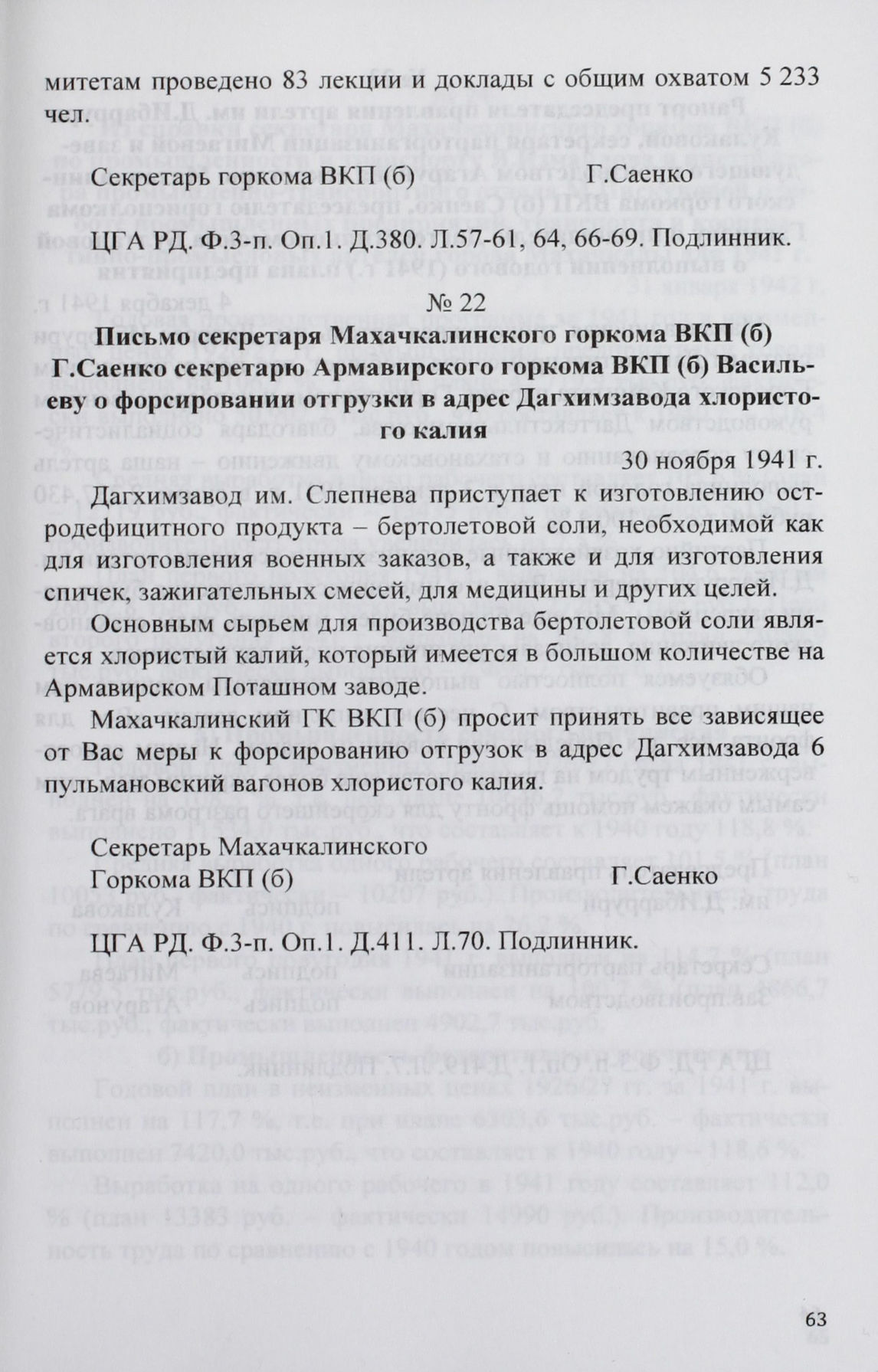 Письмо секретаря Махачкалинского горкома ВКП(б) Г. Саенко секретарю Армавирского горкома ВКП(б) Васильеву о форсировании отгрузки в адрес Дагхимзавода хлористого калия. 30 ноября 1941 г. // ЦГА РД. Ф. 3-п. Оп. 1. Д. 411. Л. 70. Подлинник.