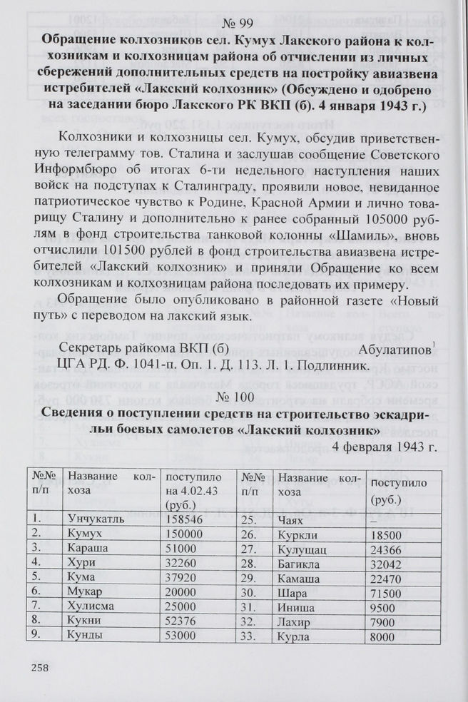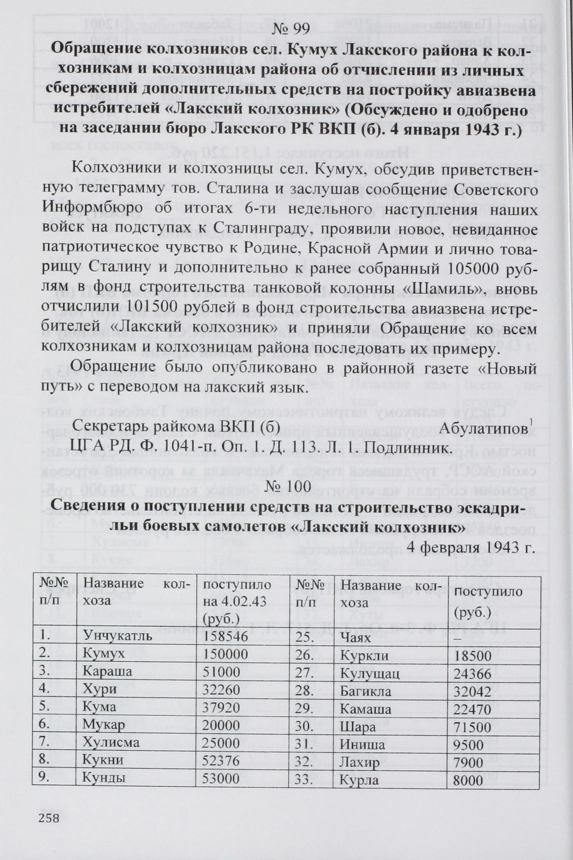 Обращение колхозников сел. Кумух Лакского района к колхозникам и колхозницам района об отчислении из личных сбережений дополнительных средств на постройку авиазвена истребителей «Лакский колхозник» (Обсуждено и одобрено на заседании бюро Лакского РК ВКП(б). 4 января 1943 г.)