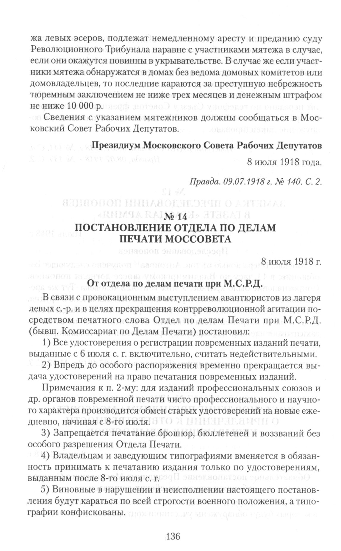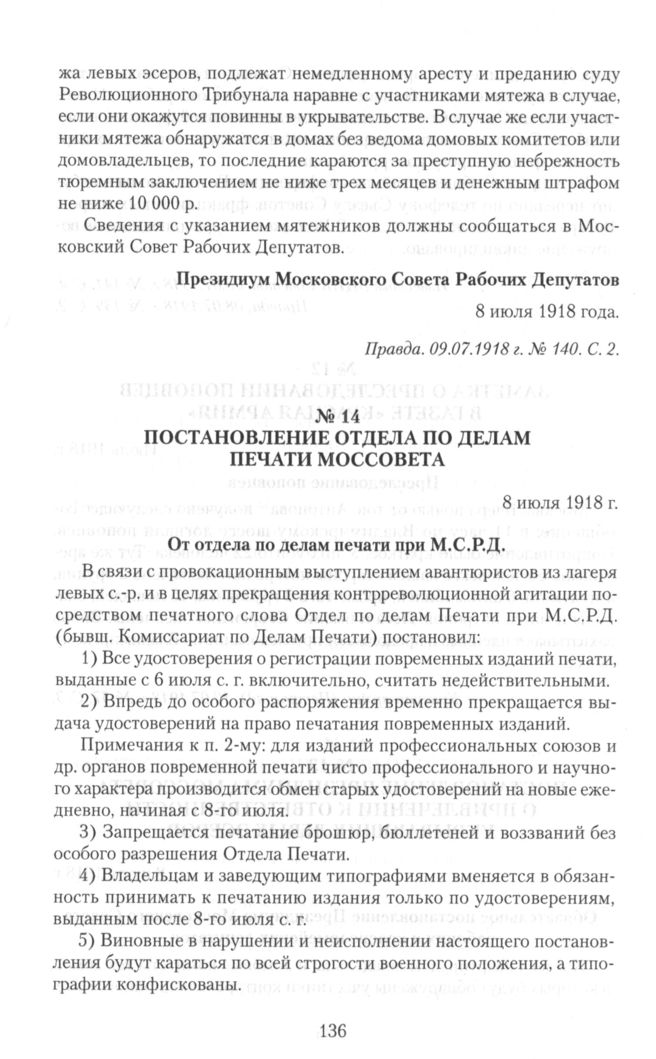 Постановление отдела по делам печати Моссовета. 8 июля 1918 г. // Правда. 09.07.1918 г. № 140. С. 2.