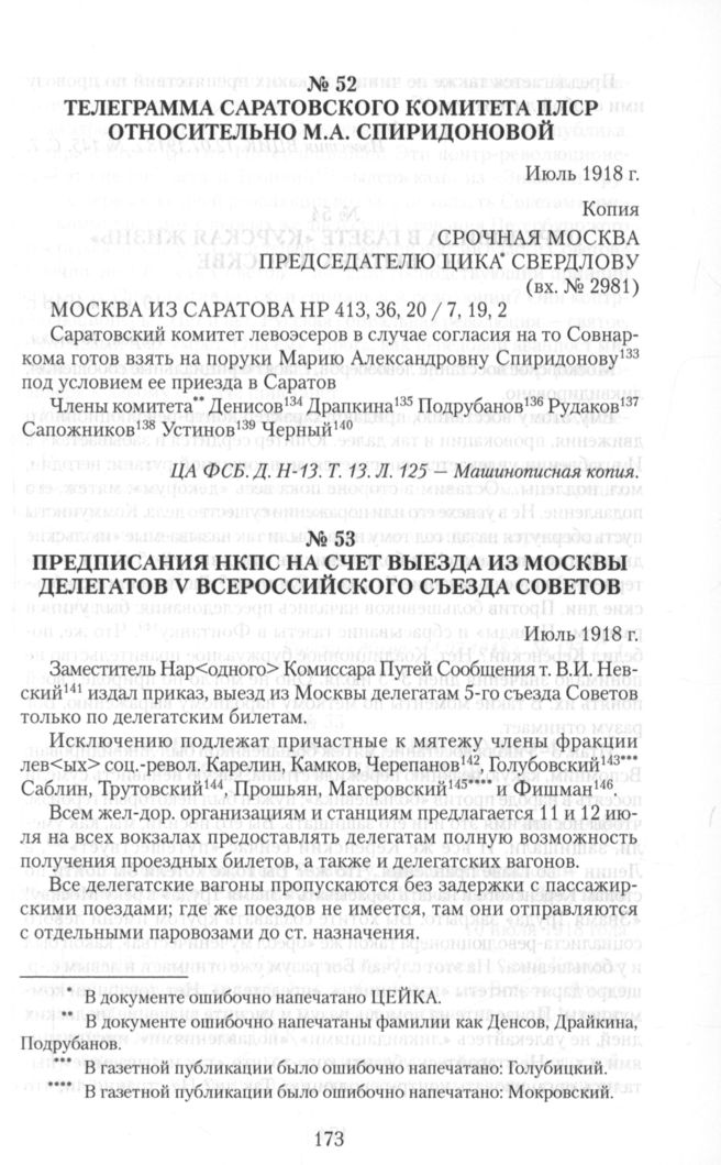 Телеграмма Саратовского комитета ПЛСР относительно М.А. Спиридоновой. Июль 1918 г. // ЦА ФСБ. Д. Н-13. Т. 13. Л. 125 —Машинописная копия.