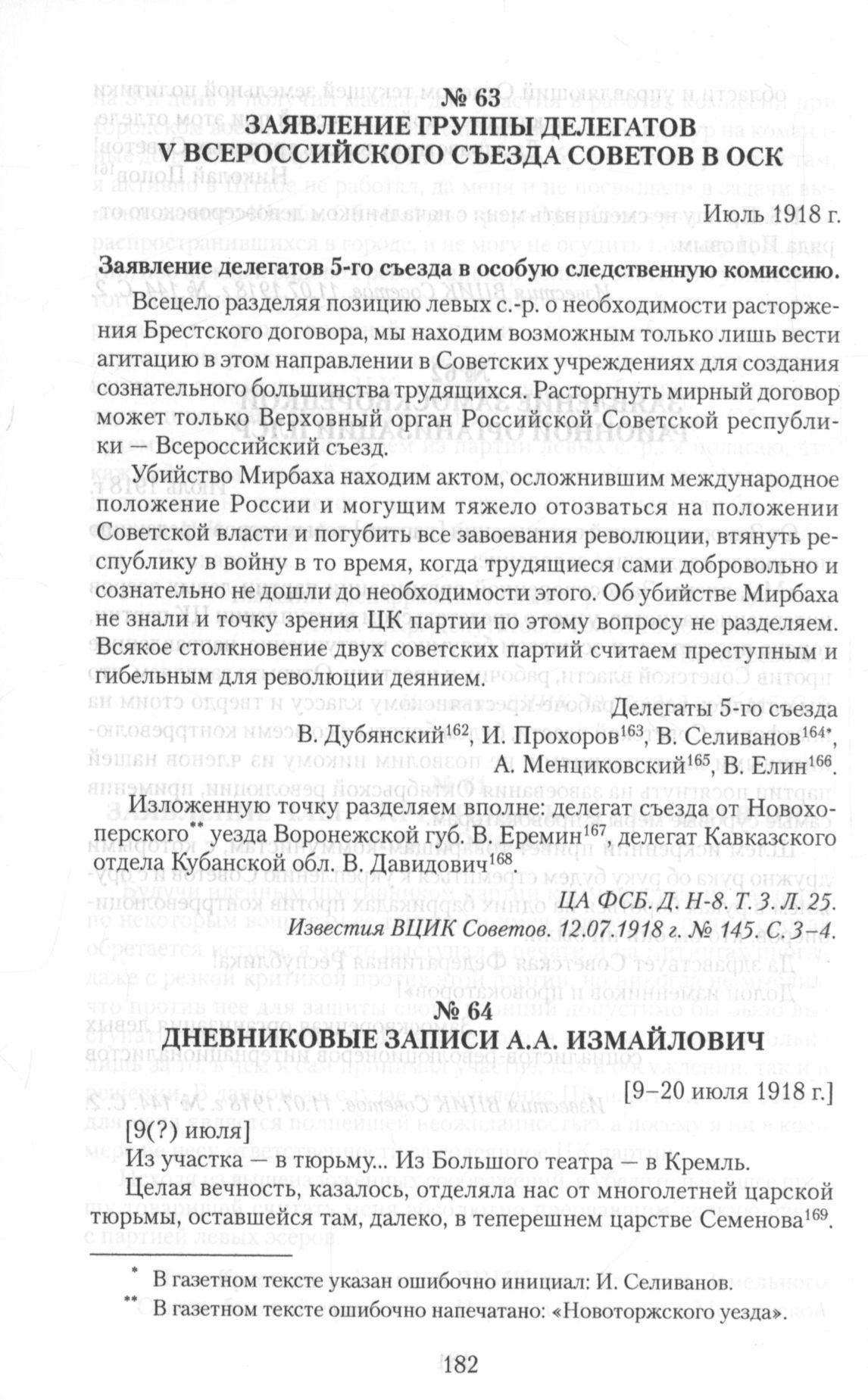 Заявление группы делегатов V Всероссийского Съезда Советов в ОСК. Июль 1918 г. // ЦА ФСБ.Д.Н-8. Т.З.Л.25. Известия ВЦИК Советов. 12.07.1918 г. № 145. С. 3-4.