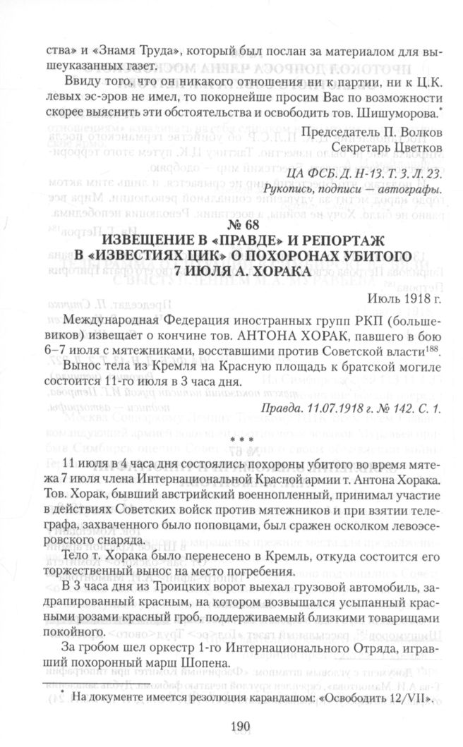 Извещение в «Правде» и репортаж в «Известиях ЦИК» о похоронах убитого 7 июля А. Хорака. Июль 1918 г. Репортаж в «Известиях ЦИК» // Известия ВЦИК. 12.07.1918 г. № 145. С. 7.
