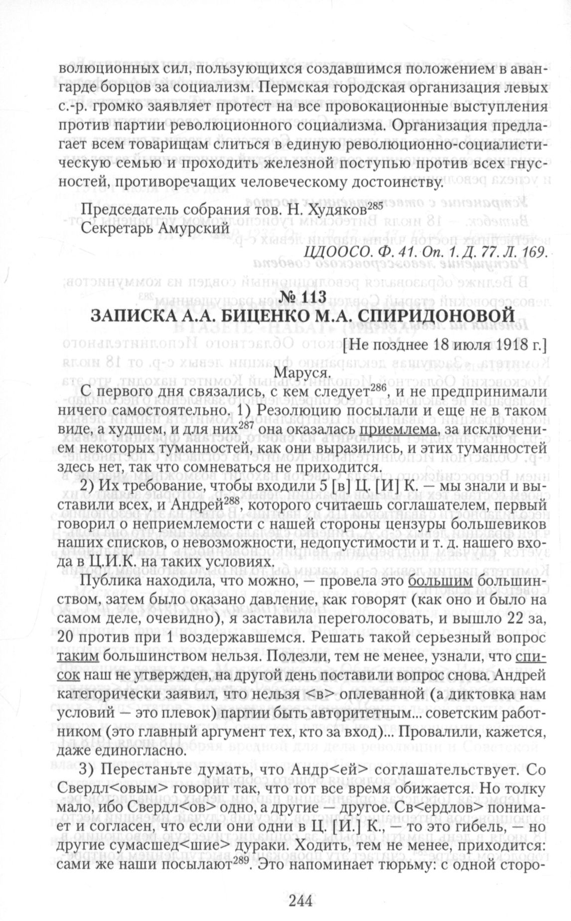 Записка А.А. Биценко М.А. Спиридоновой. [Не позднее 18 июля 1918 г.] // ЦА ФСБ. Д. Н-8. Т. 15. Л. 53, 54-54 об. Рукопись, машинопись.