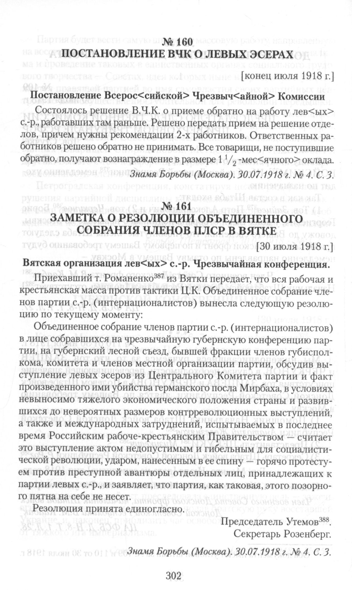 Заметка о резолюции объединенного собрания членов ПЛСР в Вятке. [30 июля 1918 г.] // Знамя Борьбы (Москва). 30.07.1918 г. № 4. С. 3.