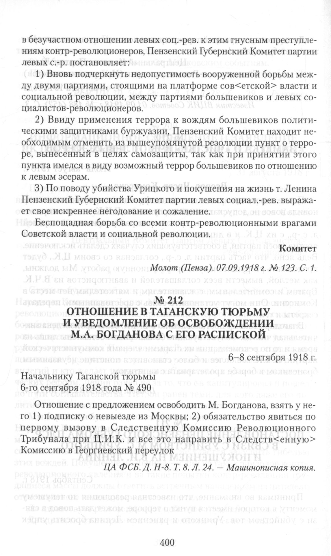 Отношение в Таганскую тюрьму и уведомление об освобождении М.А. Богданова с его распиской. 6-8 сентября 1918 г. Отношение // ЦА ФСБ. Д. Н-8. Т. 8. Л. 24. — Машинописная копия.