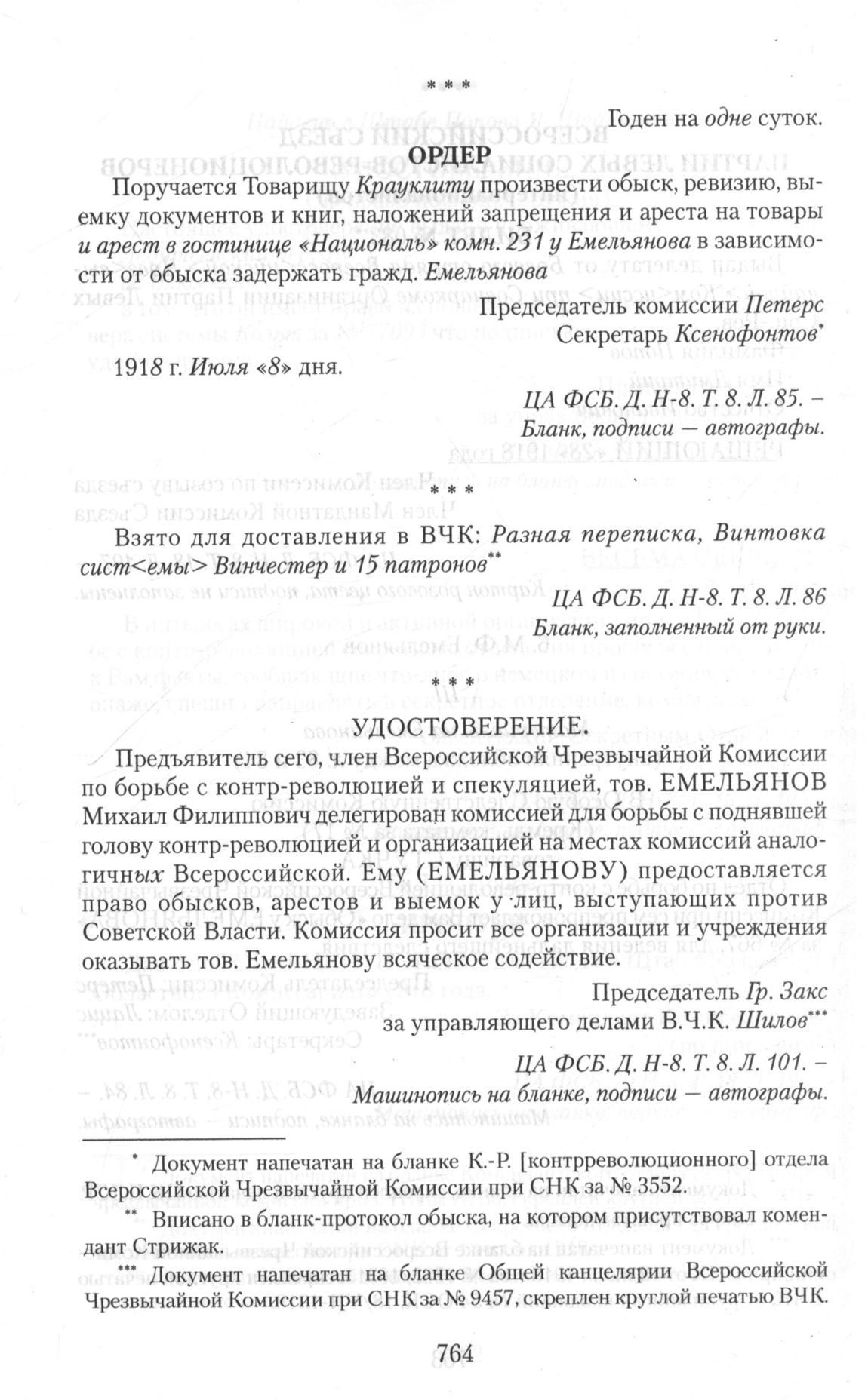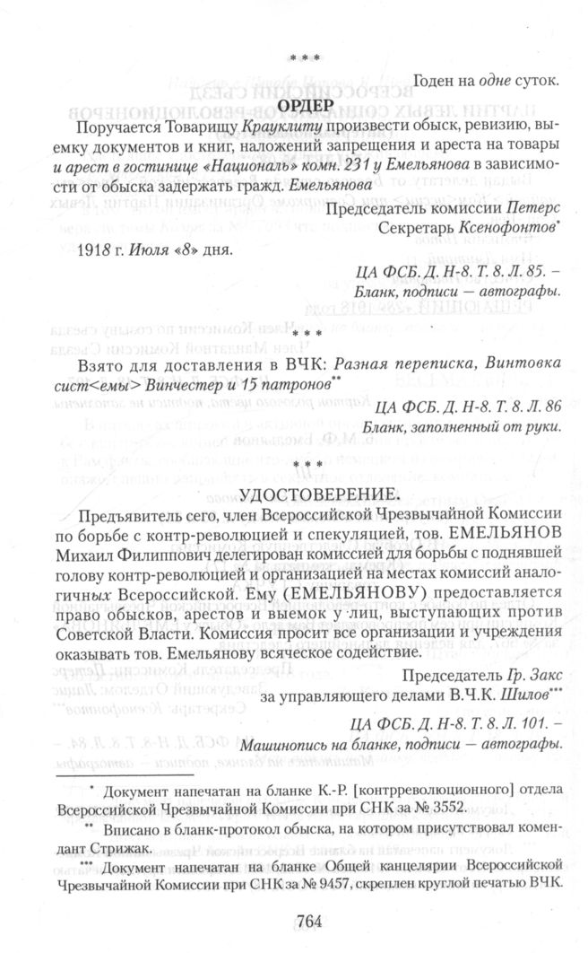 Приложение I. Личные документы левых эсеров-чекистов из дел ОСК. 6. М.Ф. Емельянов. Ордер. 8 Июля 1918 г. // ЦА ФСБ. Д. Н-8. Т. 8. Л. 85. — Бланк, подписи — автографы.